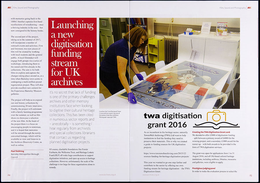 I'm delighted to share that an article about our TWA Digitisation Grant 2016 is featured in this month's Film, Sound & Photography special edition of ARC magazine.